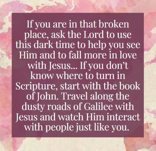 If you are in that broken place, ask the Lord to use this dark time to help you see Him and to fall more in love with Jesus. Remember, if God has kept the mother of all promises, the promise to send our Redeemer, surely you can trust Him to continue to keep all of His promises. If you don’t know where to turn in Scripture, start with the book of John. Travel along the dusty roads of Galilee with Jesus and watch Him interact with people just like you. He promises that if we seek Him, we will find Him. Right now, ask Jesus to deliver you from your sins, to come into your heart, and to open your eyes to His presence.