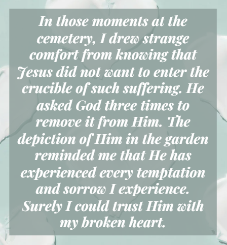 In those moments at the cemetery, I drew strange comfort from knowing that Jesus did not want to enter the crucible of such suffering. He asked God three times to remove it from Him. The depiction of Him in the garden reminded me that He has experienced every temptation and sorrow I experience. Surely I could trust Him with my broken heart. Grief continued to wash over me and erupt into uncontrollable sobs, whispering, “Lord, surely there must have been another way. I would never have sacrificed my son, but with my will, I choose to say these words, ‘Not my will, but Yours be done.’ Lord, You know I don’t mean these words, but I choose to say them.”