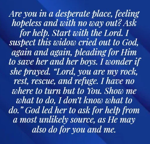 Are you in a desperate place, feeling hopeless and with no way out? Ask for help. Start with the Lord. I suspect this widow cried out to God, again and again, pleading for Him to save her and her boys. I wonder if she prayed, “Lord, you are my rock, rest, rescue, and refuge. I have no where to turn but to You. Show me what to do, I don’t know what to do.”