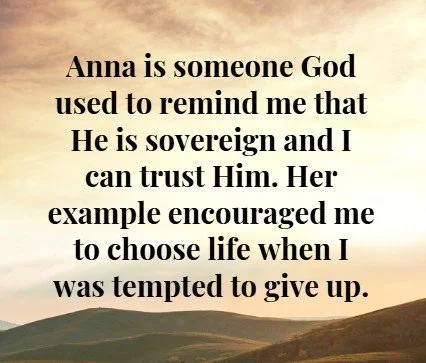 Anna is someone God used to remind me that He is sovereign and I can trust Him. Her example encouraged me to choose life when I was tempted to give up. Her love for her God and her passion for serving His people, modeled for me the fact that helping others really is a means of helping myself. I wish I could personally thank Anna for choosing a sacrificial life, a life that encourages me to see old age as a platform for continuing to offer the help and hope of Jesus that I have experienced.
