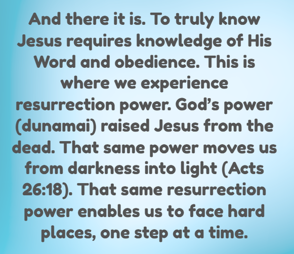 And there it is. To truly know Jesus requires knowledge of His Word and obedience. This is where we experience resurrection power. God’s power (dunamai) raised Jesus from the dead. That same power moves us from darkness into light (Acts 26:18). That same resurrection power enables us to face hard places, one step at a time.