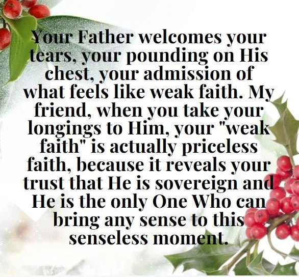 Your Father welcomes your tears, your pounding on His chest, your admission of what feels like weak faith. My friend, when you take your longings to Him, your "weak faith" is actually priceless faith, because it reveals your trust that He is sovereign and He is the only One Who can bring any sense to this senseless moment.