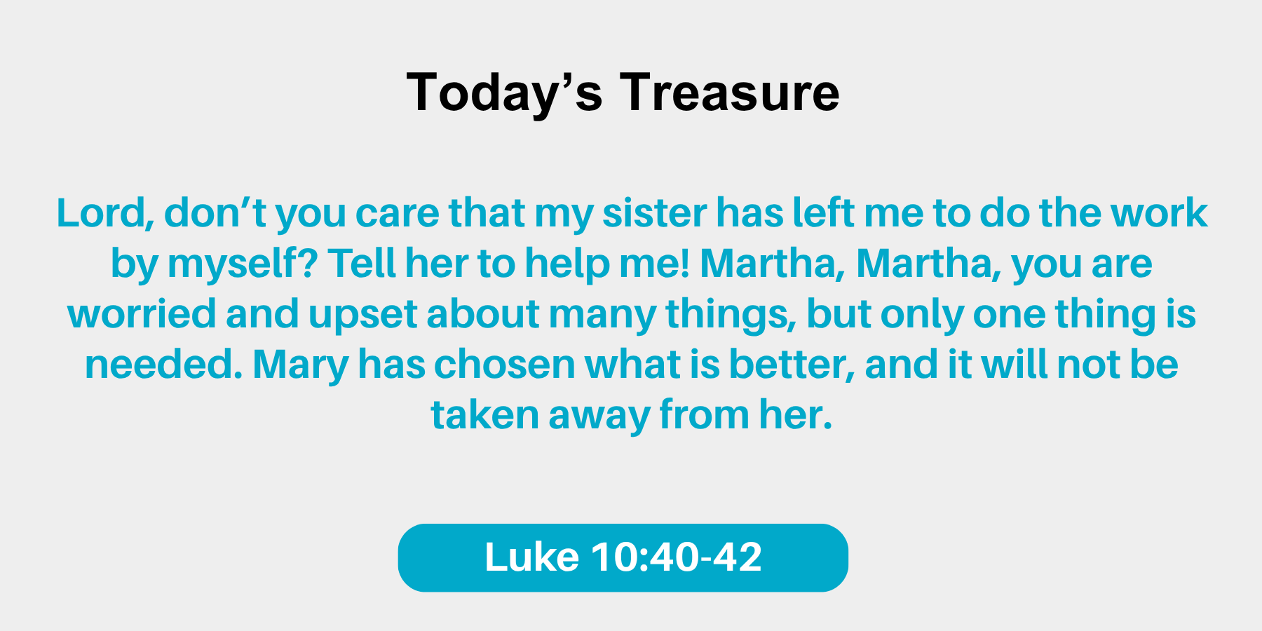 Martha, Martha, you are worried and upset about many things, but only one thing is needed. Mary has chosen what is better, and it will not be taken away from her.