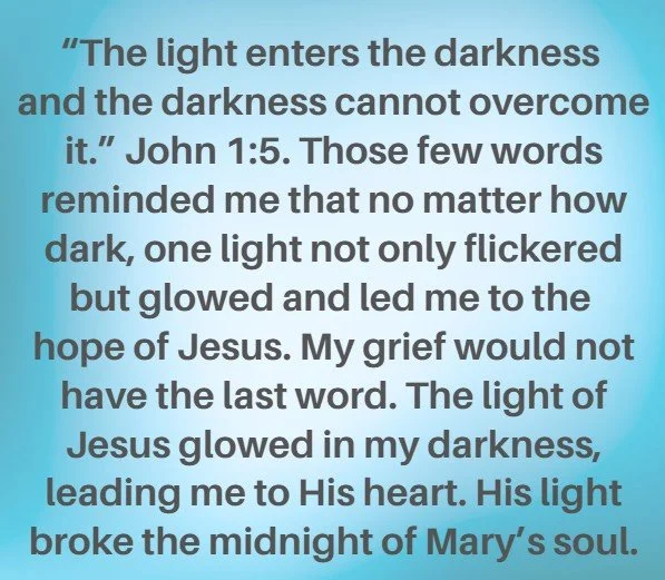Those few words reminded me that no matter how dark, one light not only flickered but glowed and led me to the hope of Jesus. My grief would not have the last word. The light of Jesus glowed in my darkness, leading me to His heart. His light broke the midnight of Mary’s soul.