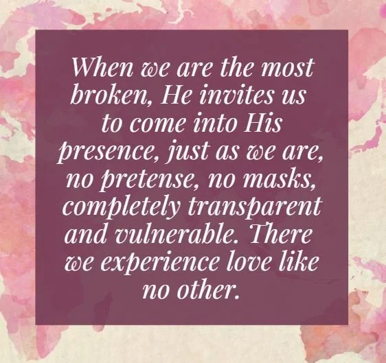 And so it is with the Lord. When we are the most broken, He invites us to come into His presence, just as we are, no pretense, no masks, completely transparent and vulnerable. There we experience love like no other.
