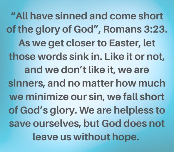 As we get closer to Easter, let those words sink in. Like it or not, and we don’t like it, we are sinners, and no matter how much we minimize our sin, we fall short of God’s glory. We are helpless to save ourselves, but God does not leave us without hope.