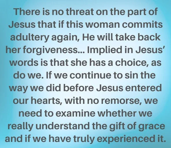 There is no threat on the part of Jesus that if this woman commits adultery again, He will take back her forgiveness. Rather, Jesus encourages her to know that holiness is a response to salvation. Implied in Jesus’ words is that she has a choice, as do we. If we continue to sin the way we did before Jesus entered our hearts, with no remorse, we need to examine whether we really understand the gift of grace and if we have truly experienced it.