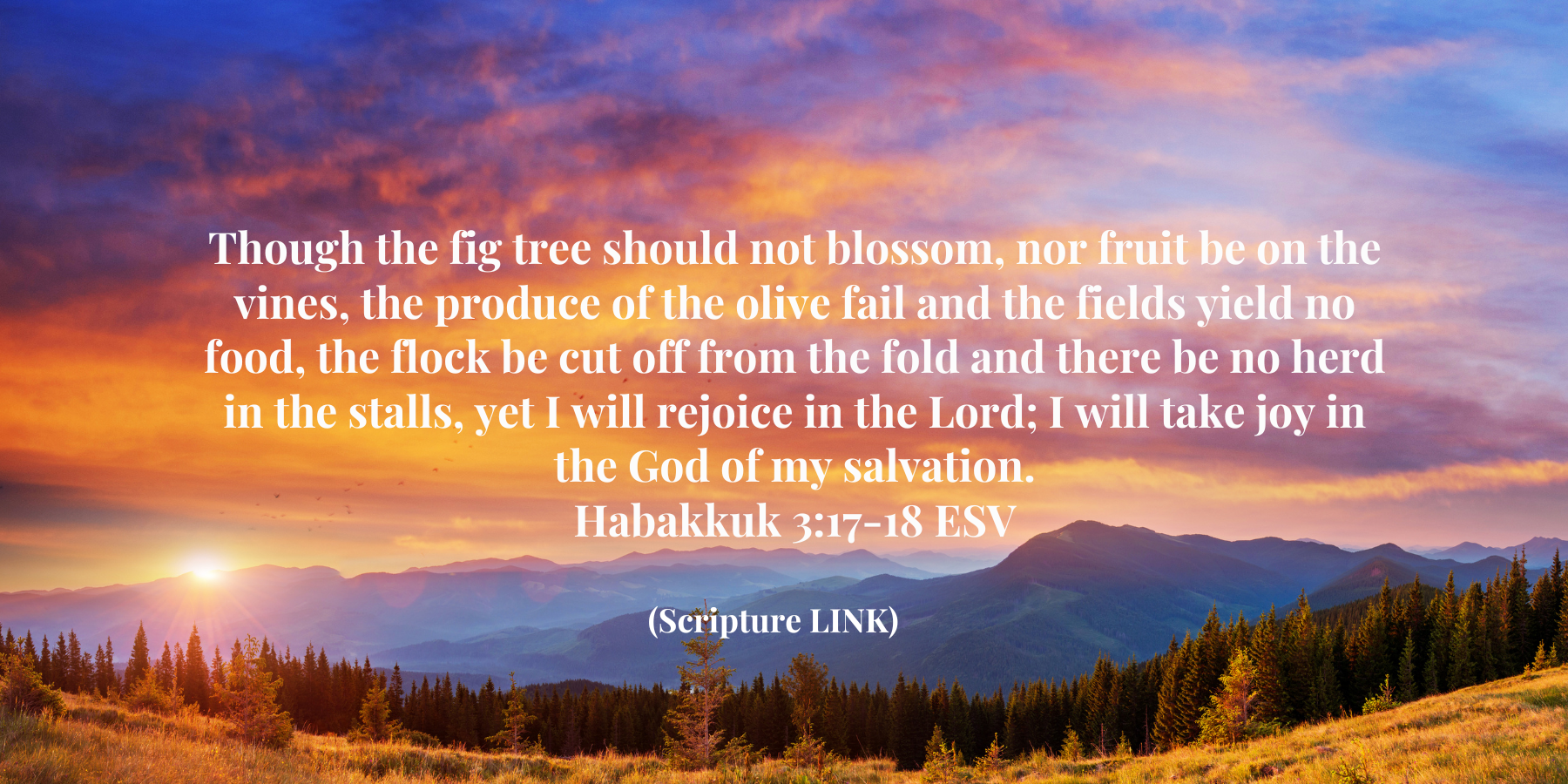 Though the fig tree should not blossom, nor fruit be on the vines, the produce of the olive fail and the fields yield no food, the flock be cut off from the fold and there be no herd in the stalls, yet I will rejoice in the Lord; I will take joy in the God of my salvation.