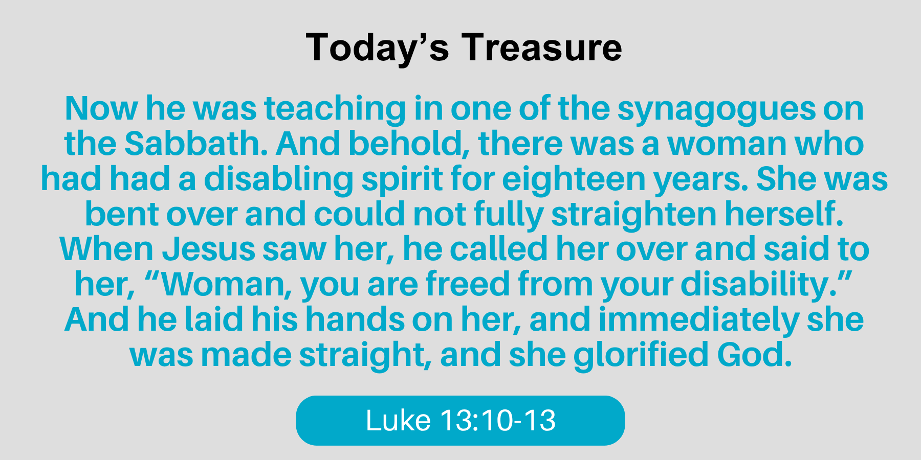 As I researched this disease, I found comments from people who suffer from it. To a person, they described painful, life-limiting symptoms. Think of the practical implications of this disease for a woman in Jesus’ time. She suffered for eighteen years, knowing she would never recover, but would continue to worsen. We don’t know if she was married, a mother, or had servants who helped guide her. When we met her, she could only look down at the dirt. Since the disease attacks bodies from the ages of 16 – 30, she was probably in her 40’s or 50’s. Were her neighbors and family so accustomed to seeing her shuffle from place to place that they didn’t notice her anymore? And why not?