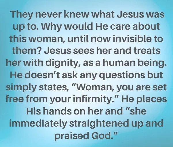 Though physically beaten down, this woman goes to the synagogue. How hard was it for her to walk to church? Unlike others, she does not seem to be in pursuit of healing but simply to hear the hopeful message of the One Who claimed to be the Messiah. Often, Jesus taught thousands of people outside on a hillside, but this time He sits in the middle of the synagogue, surrounded by followers – maybe our version of a small group Bible study. She stays on the fringes of the circle, along with the other women. Jesus sees her and calls her over. Was there total silence as she shuffled toward Him or murmuring among the onlookers? They never knew what Jesus was up to. Why would He care about this woman, until now invisible to them? Jesus sees her and treats her with dignity, as a human being. He doesn’t ask any questions but simply states, “Woman, you are set free from your infirmity.” He places His hands on her, and “she immediately straightened up and praised God.”