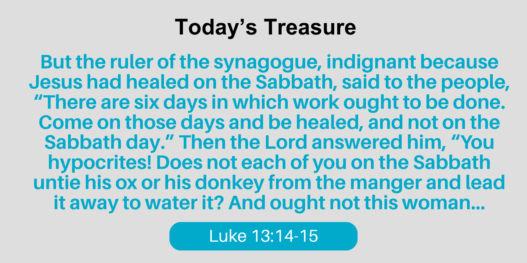 But the ruler of the synagogue, indignant because Jesus had healed on the Sabbath, said to the people, “There are six days in which work ought to be done. Come on those days and be healed, and not on the Sabbath day.”