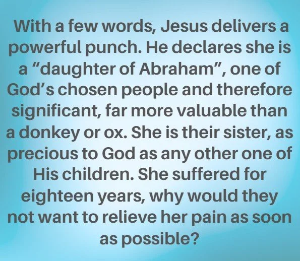 With a few words, Jesus delivers a powerful punch. He declares she is a “daughter of Abraham”, one of God’s chosen people and therefore significant, far more valuable than a donkey or ox. She is their sister, as precious to God as any other one of His children. She suffered for eighteen years, why would they not want to relieve her pain as soon as possible? Why are they not grateful she does not have the burden of her disease for one more day? He puts responsibility for her sickness on Satan, not anything she has done, who kept her “bound for eighteen long years”. His words remind them of what they already knew in their heads but apparently not their hearts – God expects His people to view hurting people as significant and with compassion that moves them to offer help. He rebukes them for not treating her with respect and honor. The religious leaders demonstrated none of that.