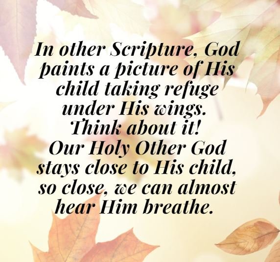 In other Scripture, God paints a picture of His child taking refuge under His wings. Think about it! Our Holy Other God stays close to His child, so close, we can almost hear Him breathe.