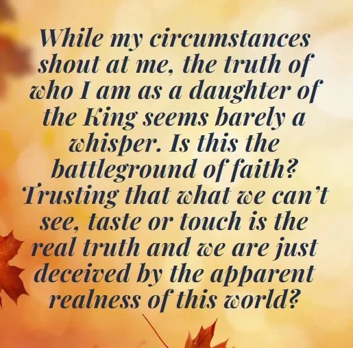 We have a Savior who is as much coming as he is come. The beautiful yet sometimes excruciating tension of the “now and not yet” can cause us to stumble and to doubt the risen Jesus. I look at my feet and I trip. I look ahead and I walk . . . maybe even gracefully. But this is tricky in the midst of life’s ins and outs. While my circumstances shout at me, the truth of who I am as a daughter of the King seems barely a whisper. Is this the battleground of faith? Trusting that what we can’t see, taste or touch is the real truth and we are just deceived by the apparent realness of this world?