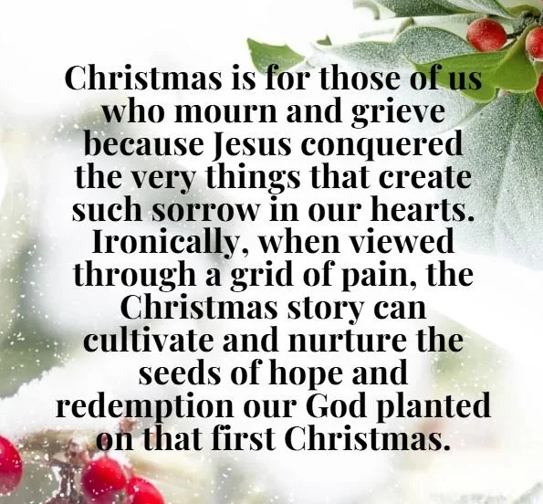 Christmas is for those of us who mourn and grieve because Jesus conquered the very things that create such sorrow in our hearts. Ironically, when viewed through a grid of pain, the Christmas story can cultivate and nurture the seeds of hope and redemption our God planted on that first Christmas. The darkness, the blood, and the death surrounding the birth of Jesus can serve to make His light even brighter for those who are desperately seeking their way on this black pathway of grief.